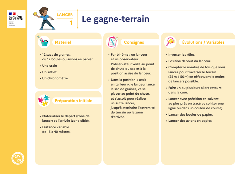 Cette ressource rassemble 15 fiches autour de la famille d'action : lancer.