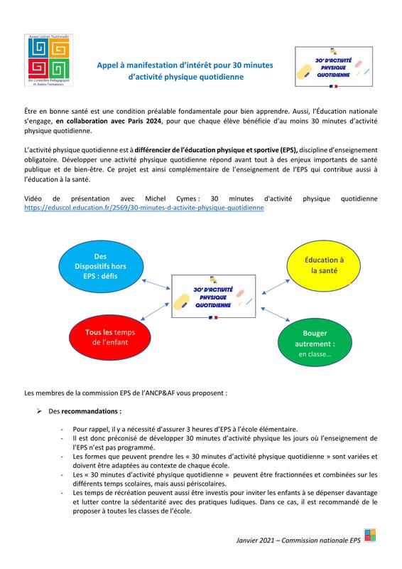 Dans le cadre du dispositif des "30 minutes d'activité physique quotidienne", l'Académie de Créteil, avec le soutien de l'USEP 94, a développé un répertoire de ressources permettant de proposer un temps d'activité physique quotidien de 15 à 30 minutes, à organiser au sein de l'école, dans les cours et/ou les préaux, en complément de l'EPS.